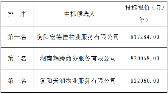 衡陽弘湘國有投資(控股)集團(tuán)有限公司院內(nèi)物業(yè)服務(wù)采購項目中標(biāo)候選人公示