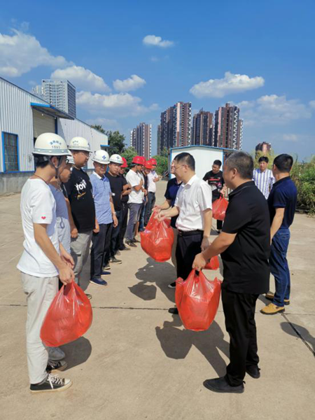 根據(jù)方案分組,公司黨委副書(shū)記、總經(jīng)理張雨民和黨委成員、監(jiān)事會(huì)主席李育和分別帶隊(duì)走訪(fǎng)慰問(wèn)了我公司業(yè)主項(xiàng)目,威馬新能源汽車(chē)公司、眼鏡小鎮(zhèn)項(xiàng)目、棚改項(xiàng)目等,在項(xiàng)目一線(xiàn),領(lǐng)導(dǎo)調(diào)度項(xiàng)目進(jìn)度,并送上“清涼包”,包中有藿香正氣水、板藍(lán)根顆粒、萬(wàn)金油、人丹、涼茶草中藥包等防暑藥品,領(lǐng)導(dǎo)們督促項(xiàng)目建設(shè)方,要切實(shí)落實(shí)好防暑降溫措施,為工友們創(chuàng)造相對(duì)舒適的工作環(huán)境,希望大家將項(xiàng)目建設(shè)得又好又快,將弘湘項(xiàng)目打造成全市模范項(xiàng)目。